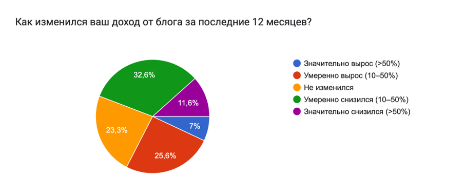 Каждый второй блогер (45%) столкнулся со снижением доходов за последний год. При этом сами авторы оценивают стабильность заработка в среднем на уровне 5–7 баллов из 10, что говорит о высокой волатильности индустрии.