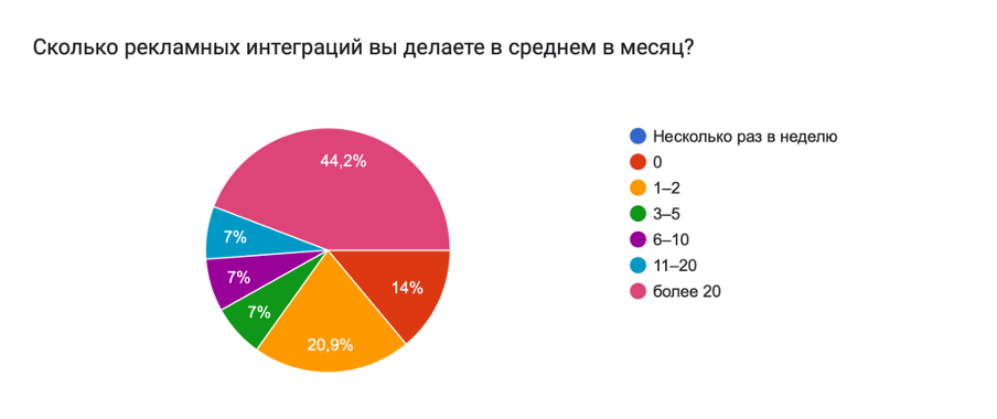 Исследование выявило: несмотря на снижение доходов, блогеры размещают всё больше рекламных интеграций. Так, 44% авторов публикуют более 20 рекламных интеграций в месяц, 20% — 1–2 интеграции, остальные в диапазоне от 3 до 20.