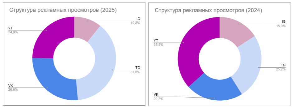 Эти данные показывают, что именно короткие вертикальные форматы становятся основным двигателем роста рекламных просмотров, тогда как остальные форматы растут значительно медленнее или демонстрируют нестабильную динамику.