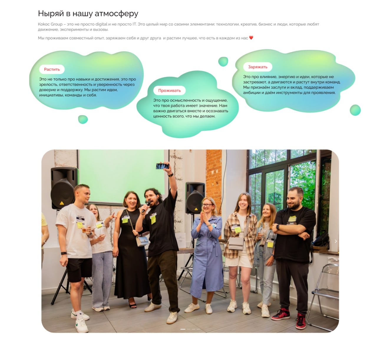 Мы «поселили» HR-бренд в ежедневные решения, процессы и стандарты. А карьерный сайт в этой логике стал не финальной точкой, а приглашением познакомиться со средой и честно ответить себе на вопрос: «Хочу ли я быть частью этой культуры и являюсь ли я тем самым Kokoc person».