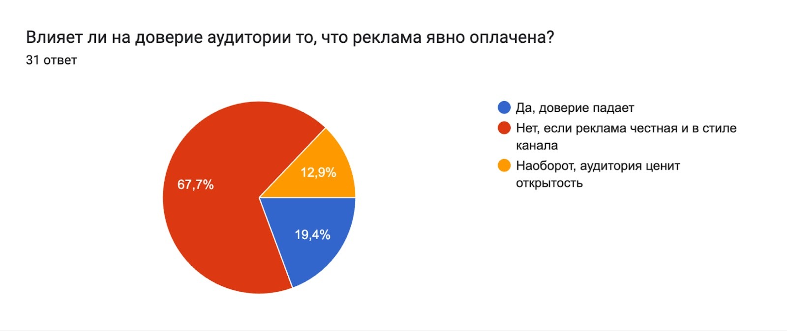Одновременно с этим фиксируется смена приоритетов. Блогеры всё чаще ориентируются не на количество размещений, а на качество контента и репутацию партнёров. Это подтверждает переход от транзакционной модели к ценностно-ориентированной. 63% респондентов считают, что маркировка рекламы не снижает доверие аудитории, если она выполнена честно и органично. Таким образом, доверие становится ключевым фактором конкурентоспособности.